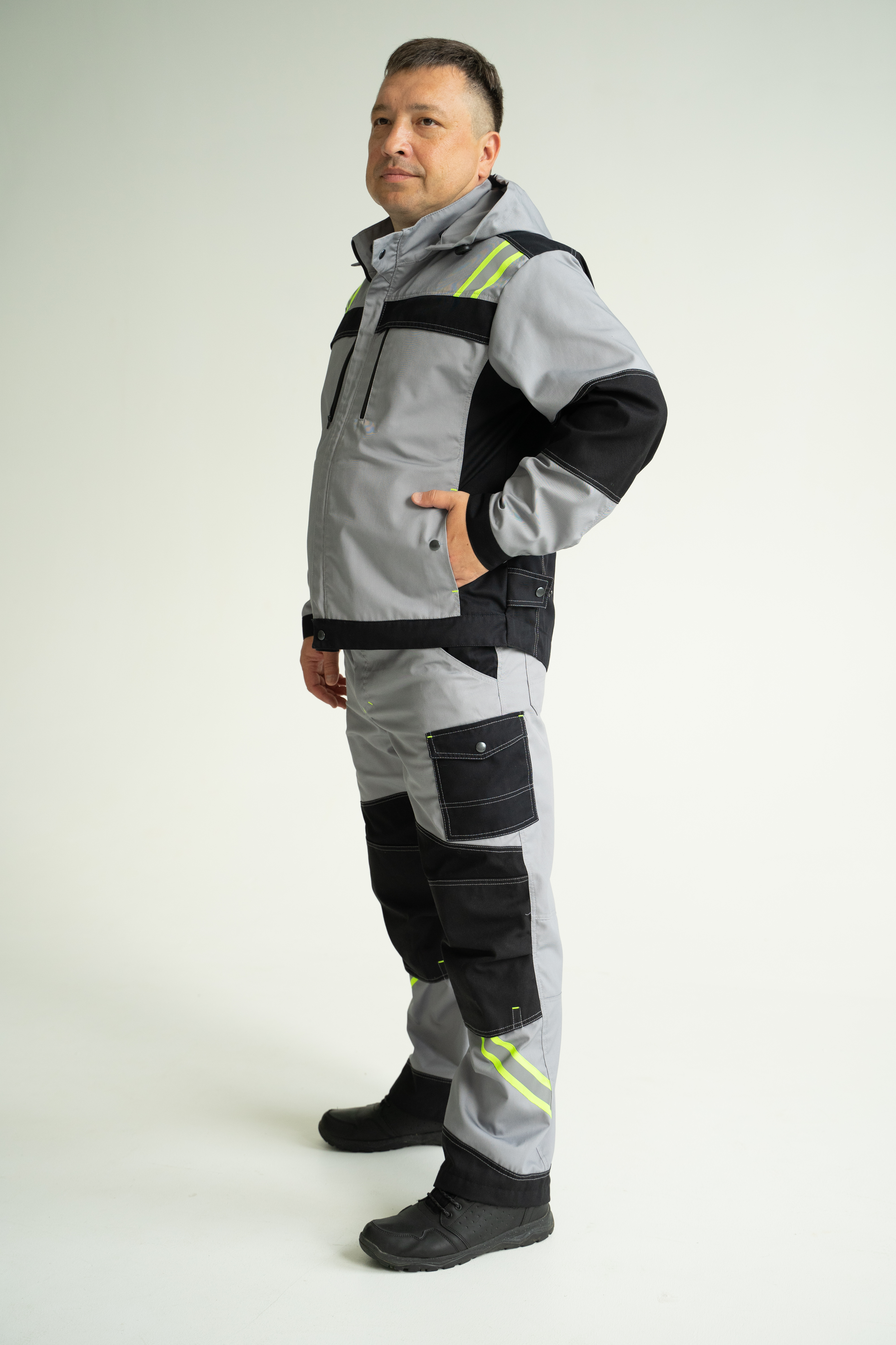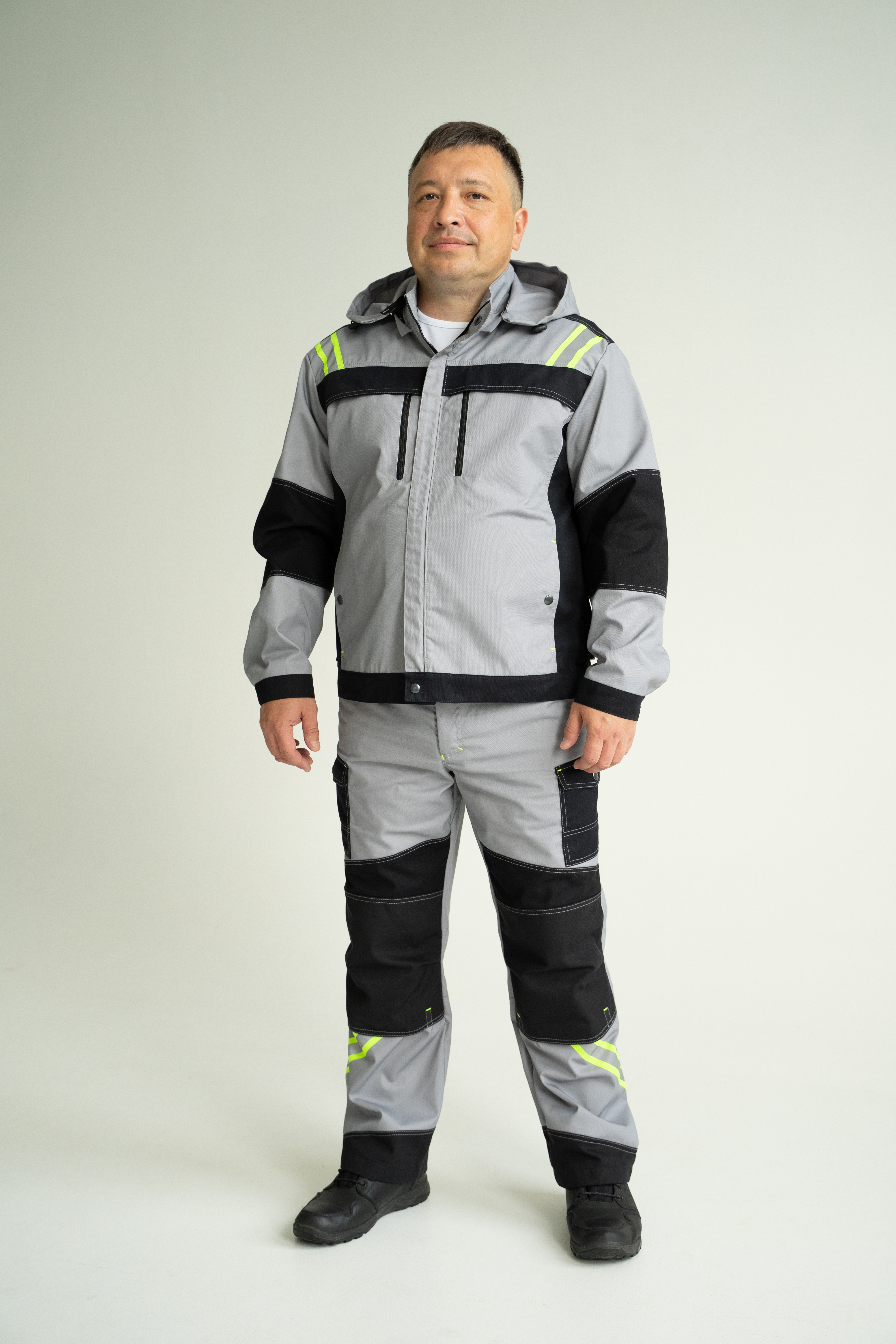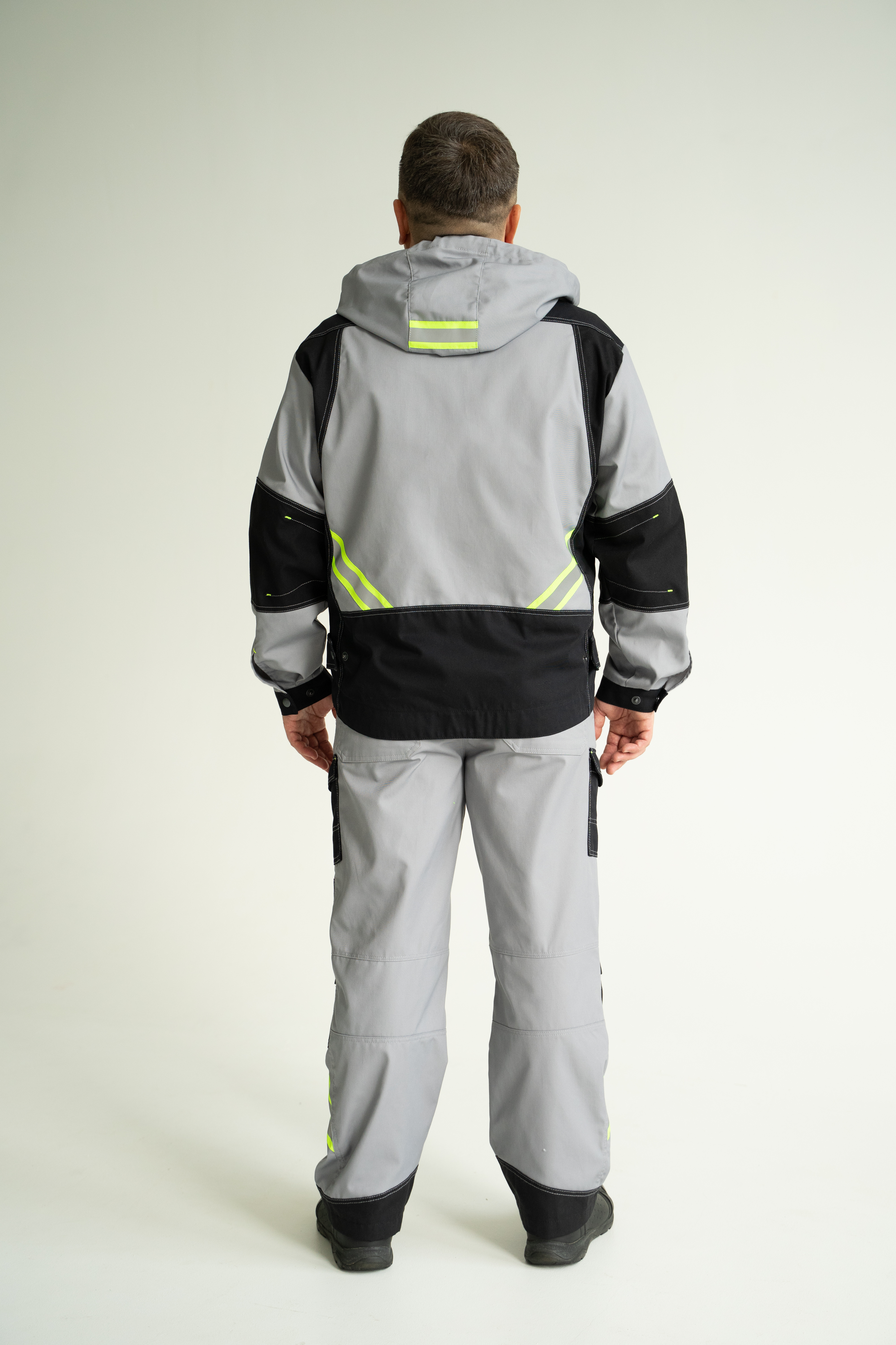 Куртка состоит из двух цветов: светло-серый основной цвет и темно-серый цвет вставок.