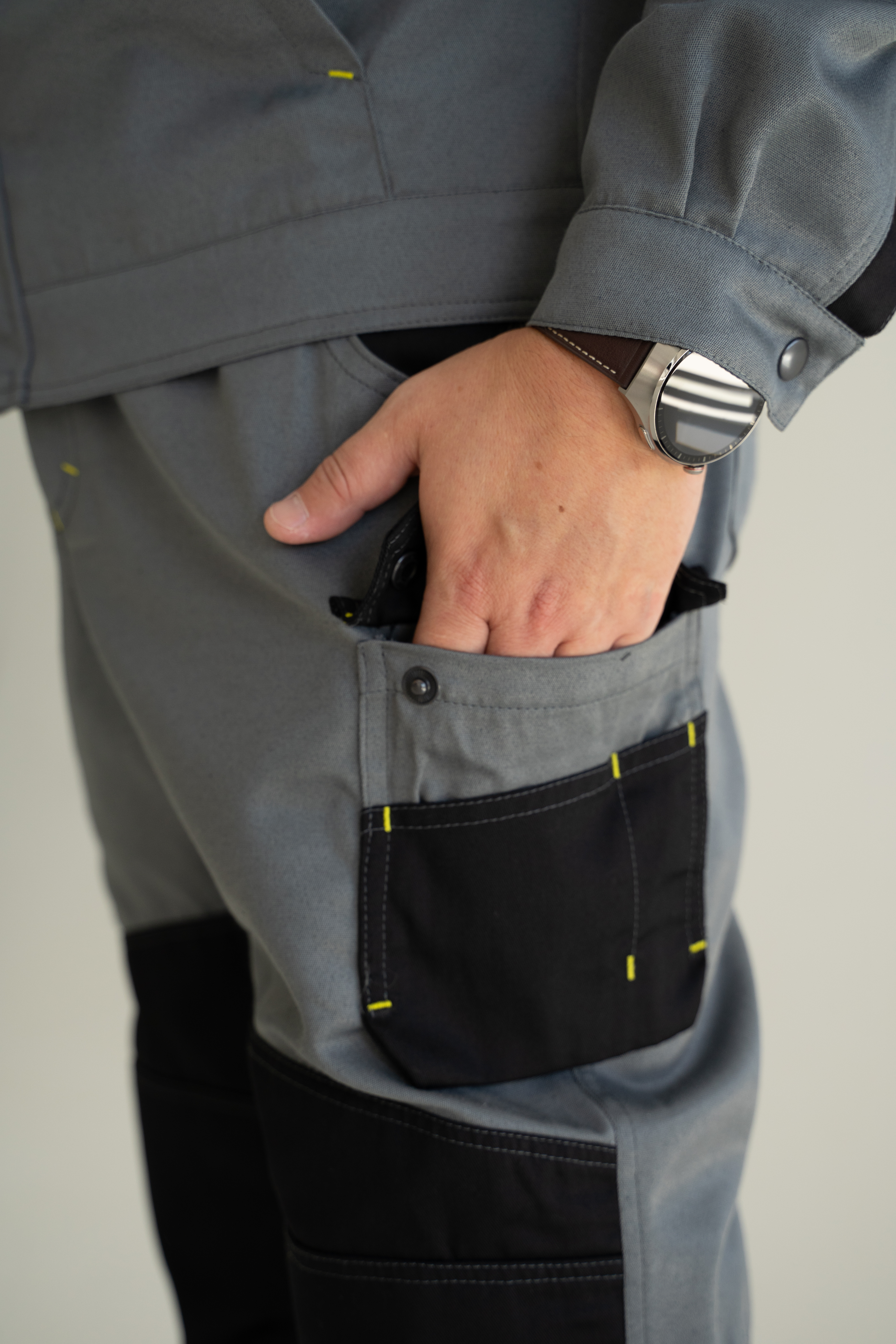 Использование деталей из эластичной ткани: на передних половинках над наколенниками для удобства при приседании и сгибании ног в коленях